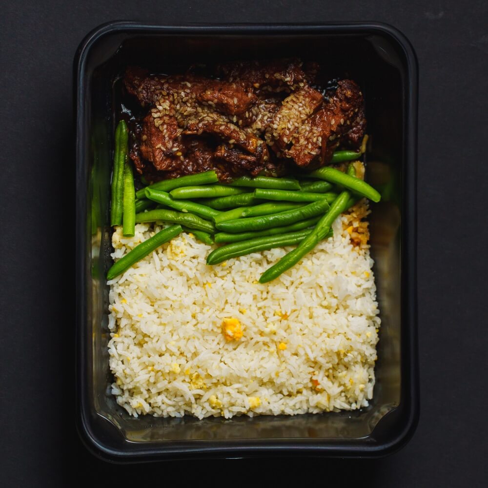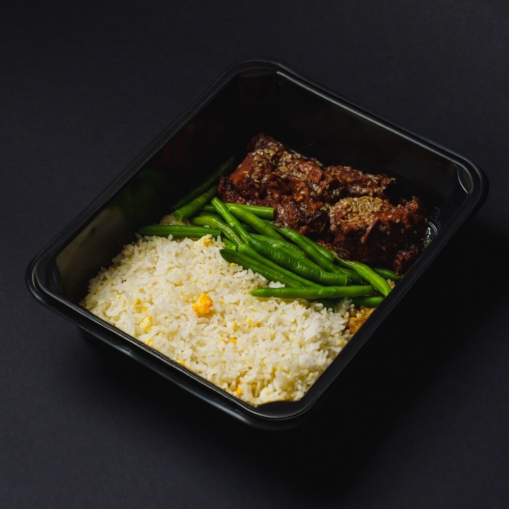 Zloženie: Hovädzie mäso sous vide 42%, ryža basmati 24%, zelené fazuľové lusky 15%, domáca teriyaki omáčka 6,6% (SÓJOVÁ omáčka bez lepku, med, čerstvý zázvor, ryžový ocot, cesnak, zemiakový škrob, údená paprika), VAJCIA 4,5%, soľ 0,27%, repkový olej 0,09%, SEZAM 0,3%.