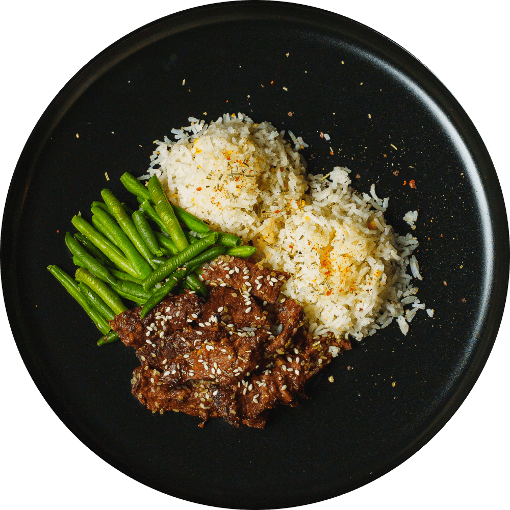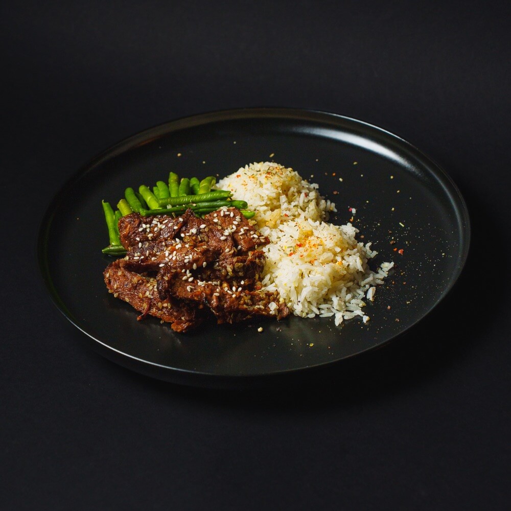 Hovädzie rezančeky sous vide v domácej teriyaki omáčke, vajíčková ryža Basmati, zelené fazuľky.