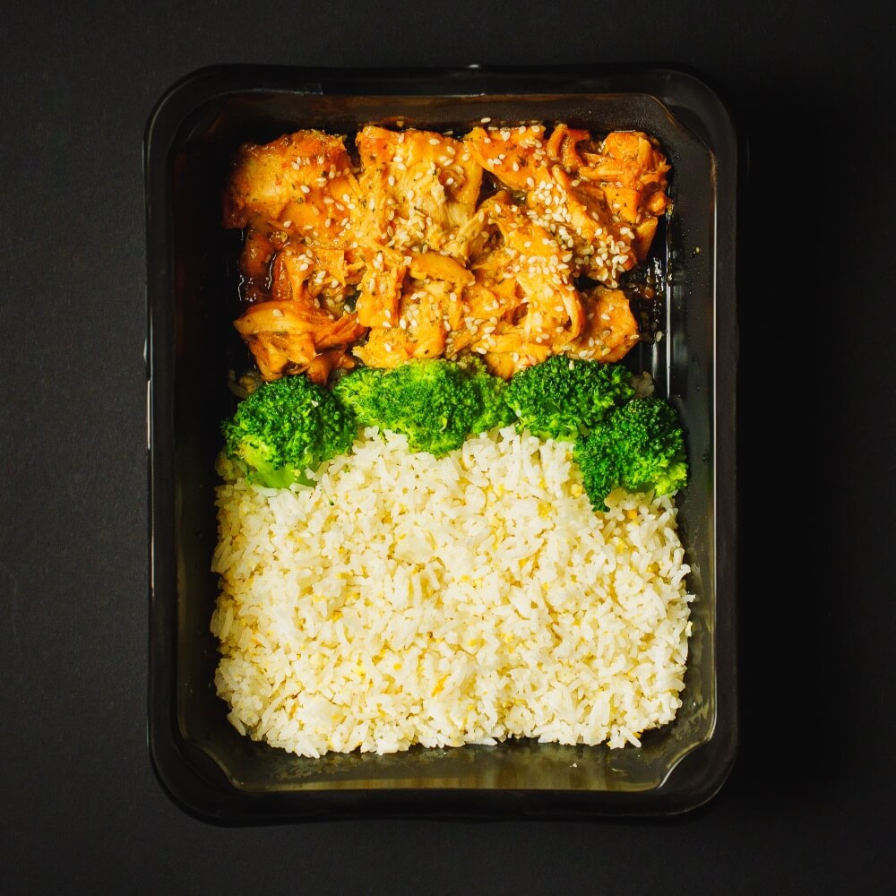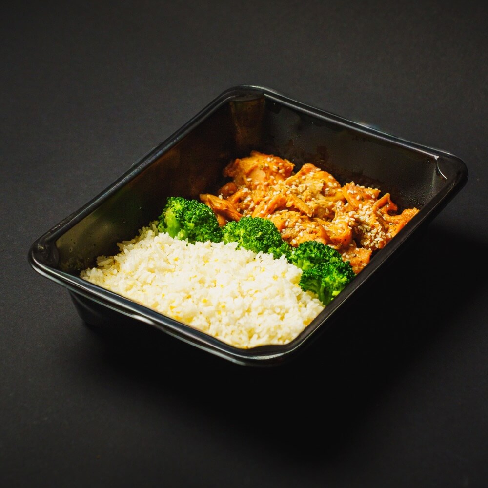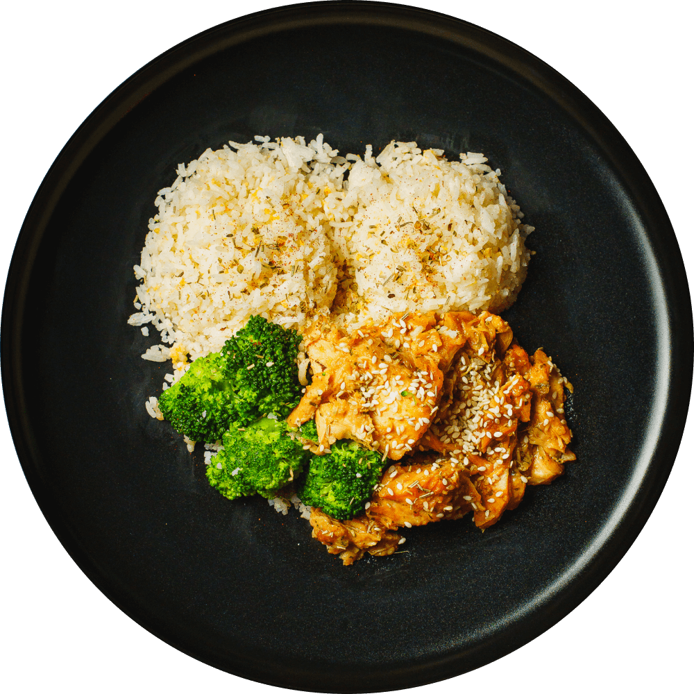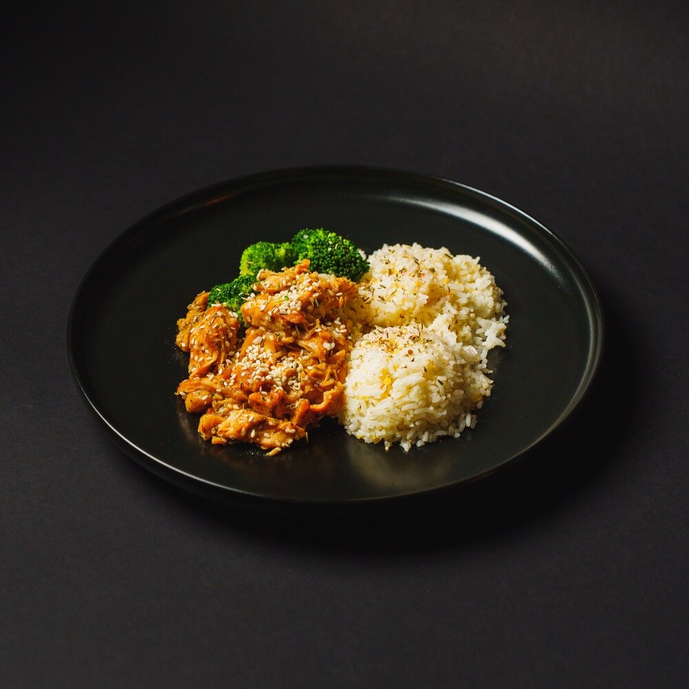 Šťavnaté kuracie prsia v domácej teriyaki omáčke, vajíčková ryža basmati, brokolica.