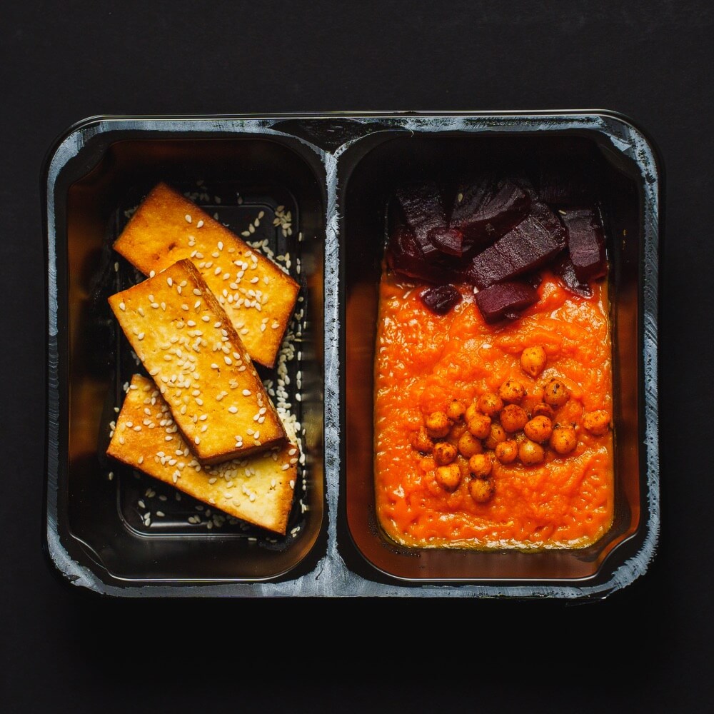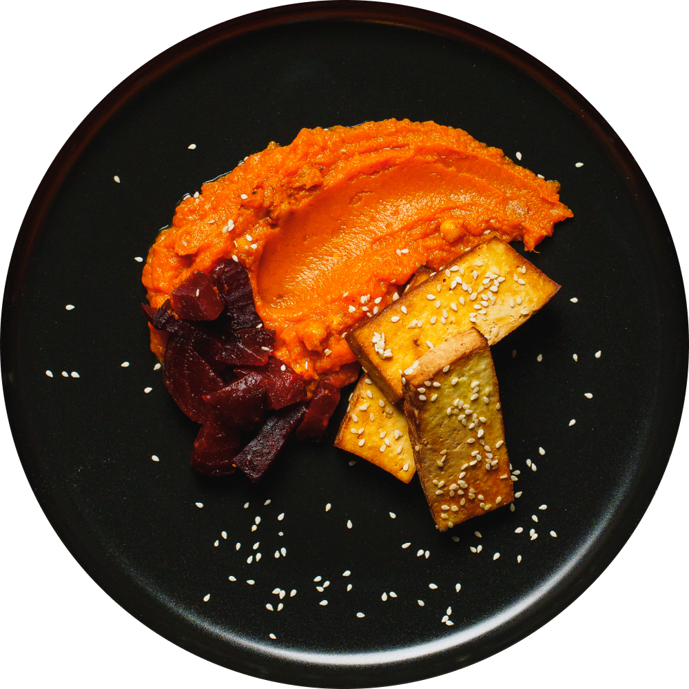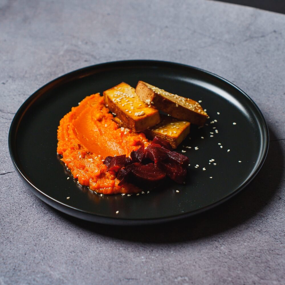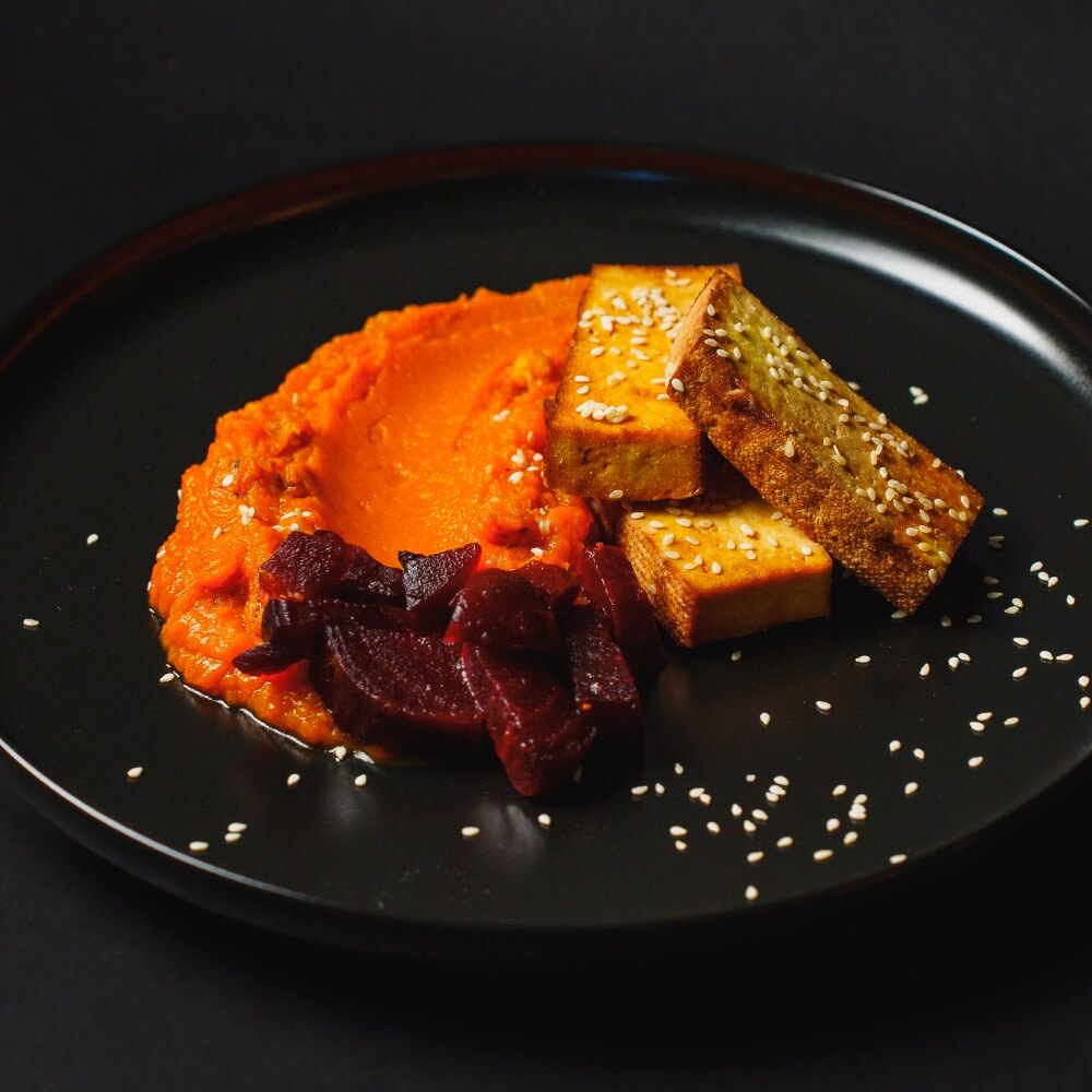 Údené grilované tofu, domáce batátové pyré, pečená cvikla, pečený cícer.